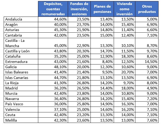 Por comunidades autónomas, los gallegos son los que lideran la opción de los depósitos con el 48,10% de los encuestados. Este año, esta opción ha caído en todas las comunidades si comparamos los datos con 2018. El descenso más pronunciado se ha producido en Valencia donde ha caído un 1,98%.