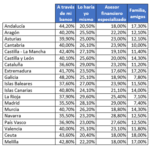 La cuarta opción es contar con el asesoramiento de familiares o amigos. En este caso no ha habido movimientos en comparación con hace un año y el porcentaje se ha mantenido en el 10,5%. En Andalucía se registra el mayor porcentaje con un 17,3%, baja levemente en comparación con 2018. Si comparamos los datos con el año pasado, donde más crece esta respuesta es en las Islas Canarias con un aumento del 0,64%.