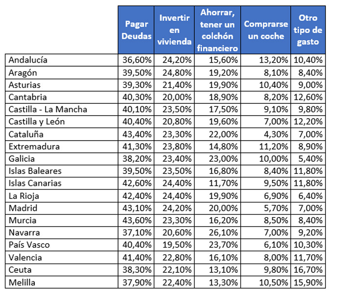 La cuarta opción es dedicar el dinero para 'otro tipo de gasto' para el 10,9% de los consultados y comprarse un coche para el 6,4%. Dentro de estas opciones, destaca Ceuta donde el 16,70% elegirían gastarse el dinero en otras opciones que no fueran ni vivienda ni coche. En el caso de la compra de un coche, los andaluces son los que más optarían por esta opción (13,20%).